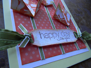 This super fun card was what Debbie had us make last Wednesday and I have to say ...... This will FOR SURE be one of those CASE Card I make for an upcoming Stamp Camp.Debbie started us out with a square piece of DSP and we just did some basic folding and made these "OH SO PRETTY" flowers. I also had some extra 1/8" Taffeta Ribbon left over so.....I added two tiny pieces to the middle of my flower. DARLING OR WHAT!
