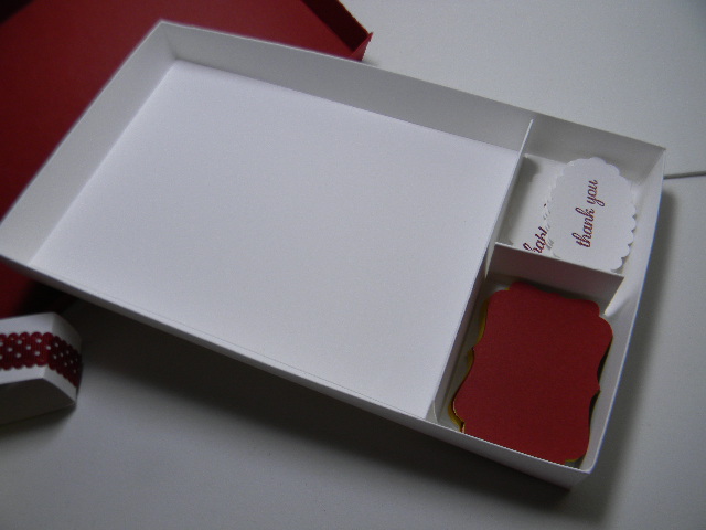 This is the PERFECT GIFT GIVING IDEA. It starts with a 7-1/2"x10-3/4" piece of Whisper White and Cherry Cobbler. You score at 3/4" and 1-1/2" on all four sides. The trick is to use one of Connie Stewarts Score Shims when you score your lid. It's a piece of clear window sheet that when attached to your Simply Score Board.......creates the perfect fit for your box lid and box base to fit together.