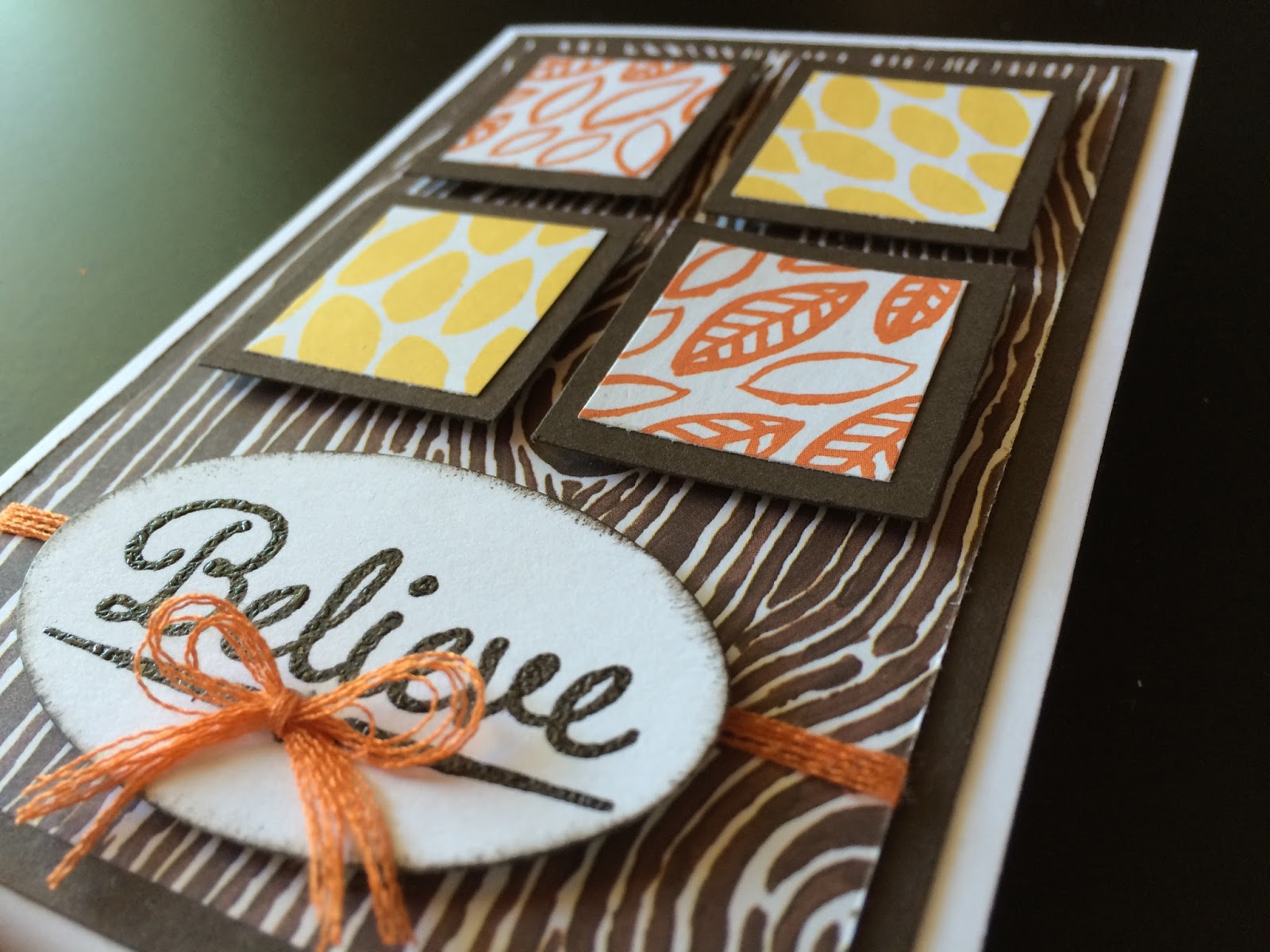 This card was made with the Stampin' UP! 'Note Cards' and comes together pretty darn quickly. I used the 'Into the Woods' Designer Series Paper collection for the wood grain background panel and also for each of the 1" squares I made for the center.