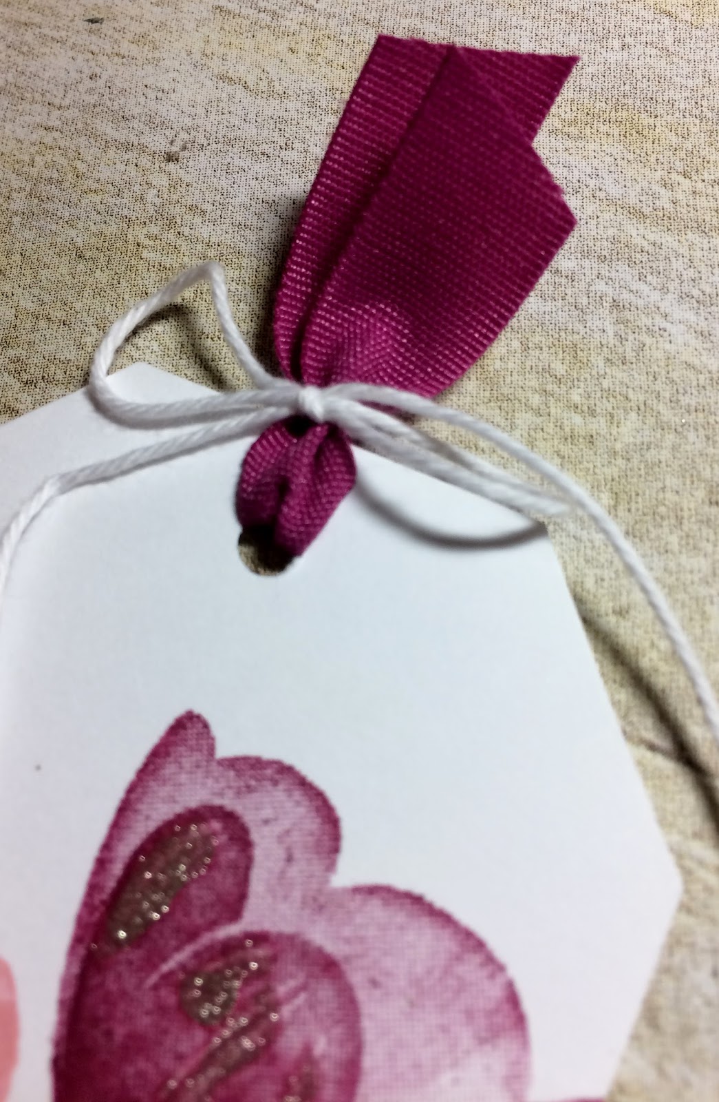 The final touch for my tag was adding some Berry Burst 1/2" Finely Woven Ribbon to the top of my tag and finishing it off with a pretty Whisper White Baker's Twine bow.