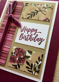 I started this card out by cutting panels of the 'Share What You Love Specialty Designer Series Paper' and positioned each of those panels onto a panel of Crumb Cake card stock. For this long skinny panel.......I wrapped some of the OH SO YUMMY 'Rich Razzleberry 1/4" Velvet Ribbon' around it.