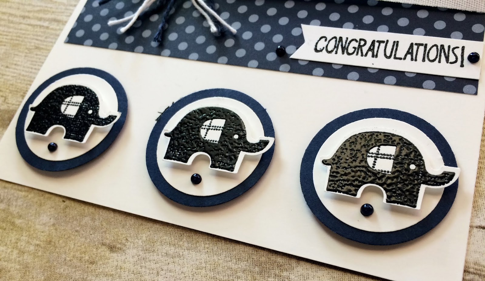 I kept the same trio of stamped elephants for this upgraded card ...... But reversed the layering of the circles. And one additional touch was adding a tiny pearl that was colored in with my 'Night of Navy Stampin' Blends Marker' under each little elephant.