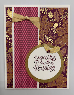 I started out with a White base card ..... And added a panel of the 'Blackberry Beauty Designer Series Paper' to the top. I did add one additional panel of the 'Blackberry Beautfy DSP' down the left hand side of my card for some added WOW FACTOR.Before I adhered that panel down to the front of my card ...... I added some 'Gold 1/4" Shimmer Ribbon' to the top and tied it off into a pretty knot.