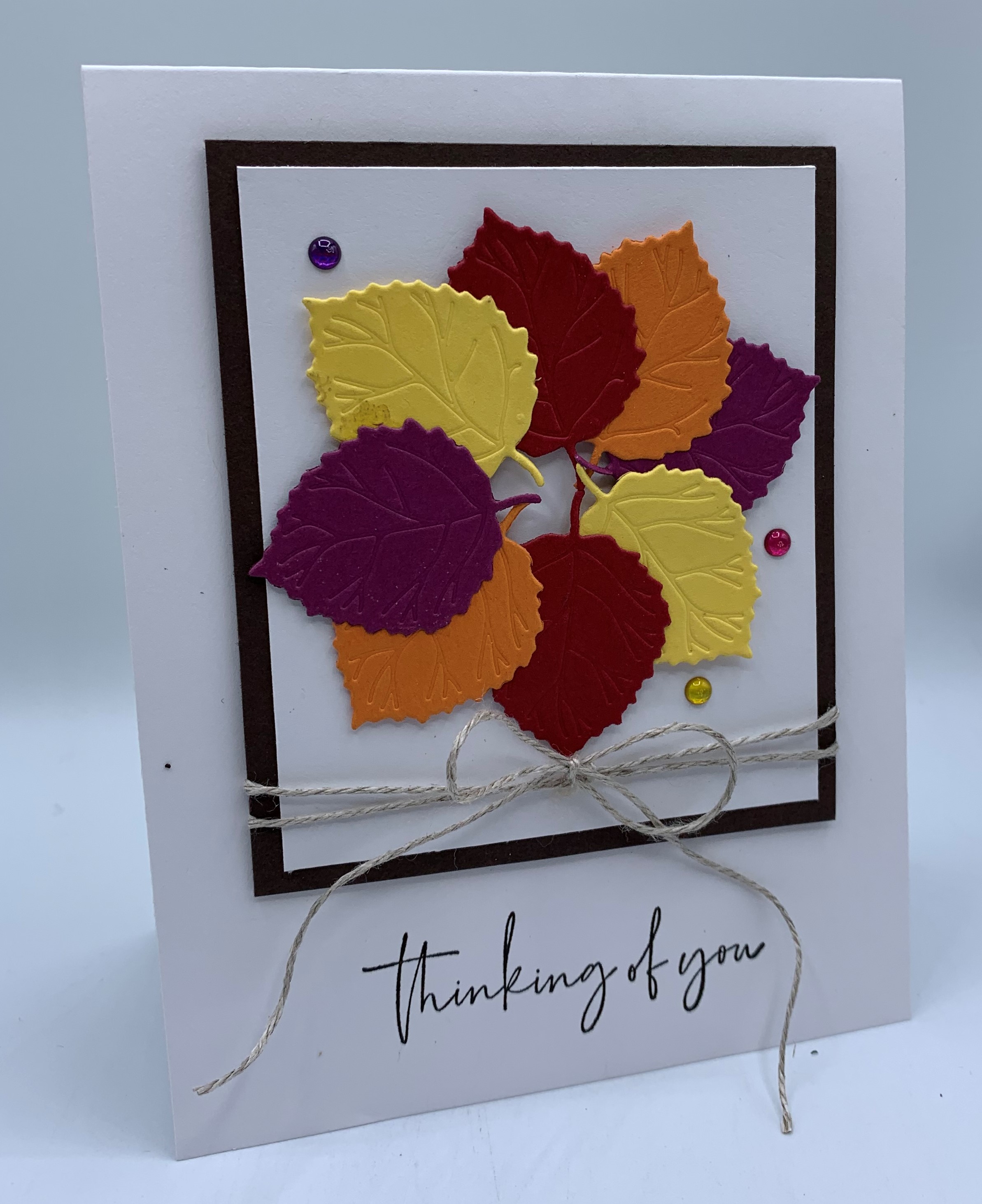 Then I got busy and created my Fall Wreath. I used the 'Aspen Trees Dies' to crop out 2-sets of 4-different colors of leaves. I arranged those leaves into a wreath pattern and adhered them down with Stampin' Dimensionals.